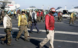 aircraft. I am surprised by the number of men working on the flight deck, but everyone knows his job. They wear coloured jerseys indicating their exact